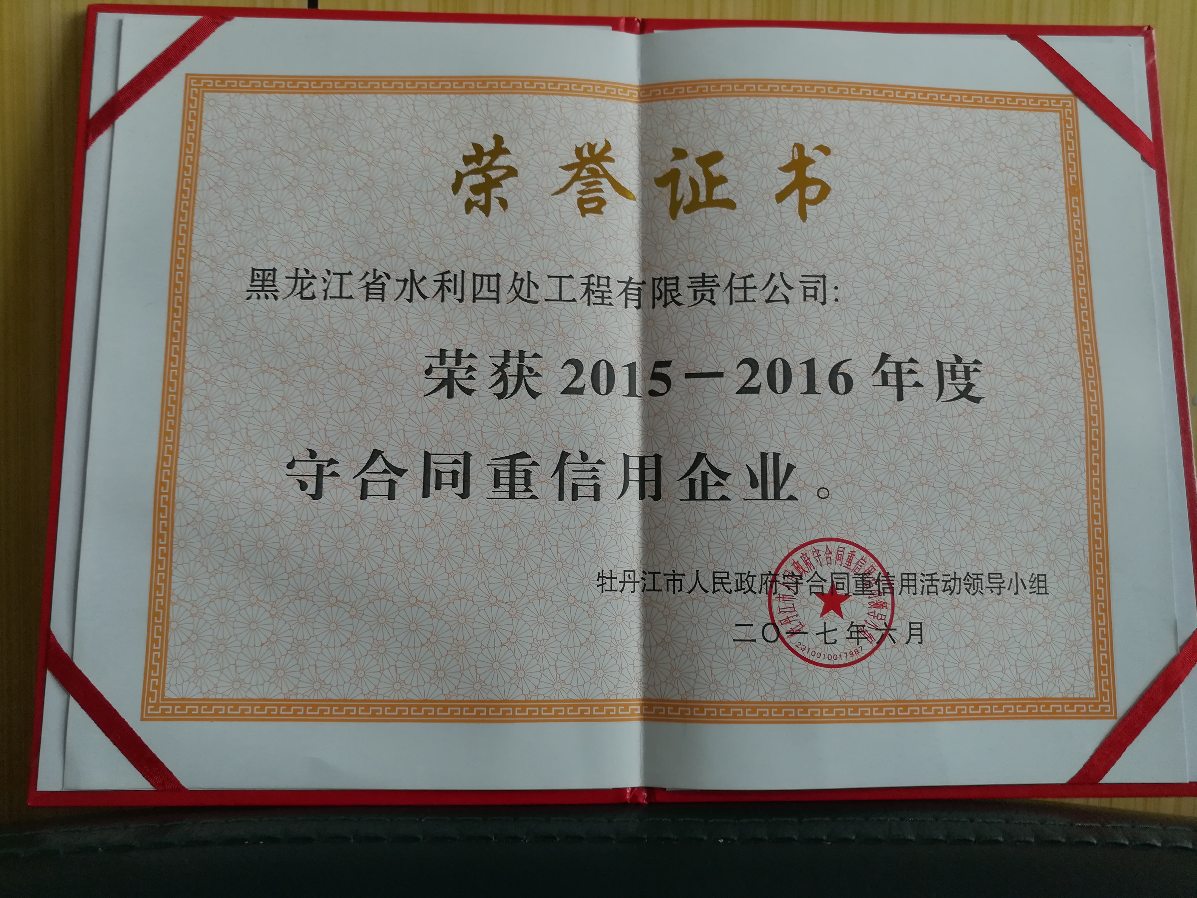 2017年6月初,我公司再次被牡丹江市政府授予“守合同重信用企業(yè)”榮譽稱號。迄今為止,這是我公司連續(xù)十四年獲此殊榮。