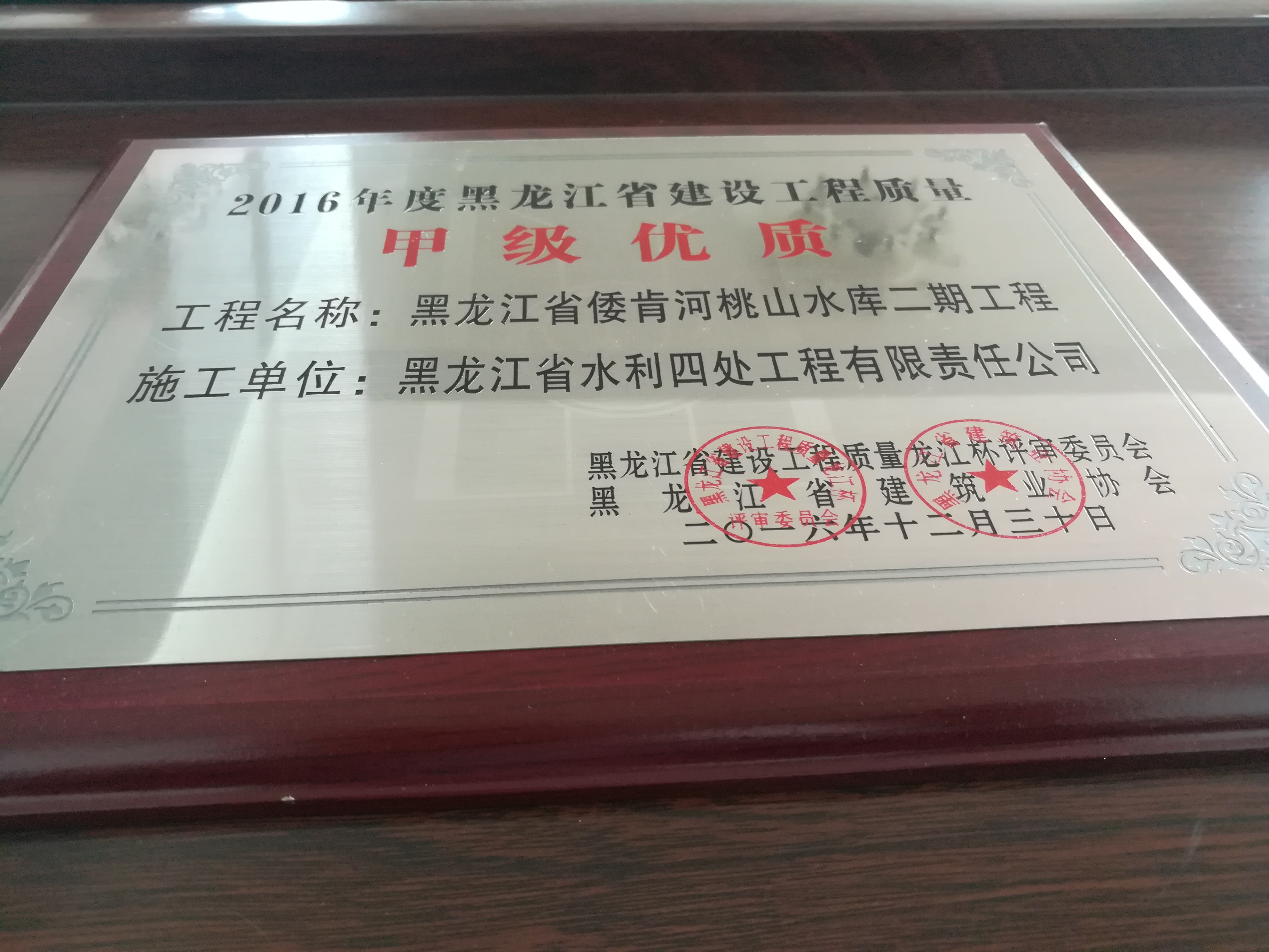 我公司承建的七臺(tái)河市倭肯河桃山水庫二期工程,被黑龍江省龍江杯評審委員會(huì)、黑龍江省建筑業(yè)協(xié)會(huì)評為2016年度全省建設(shè)工程質(zhì)量甲級(jí)優(yōu)質(zhì)工程,獲獎(jiǎng)證書、光榮冊和獎(jiǎng)牌于日前一并發(fā)放到我公司手里。