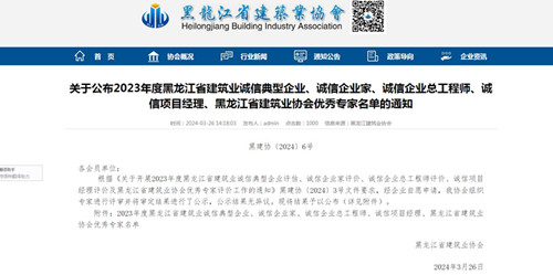經(jīng)省有關(guān)部門綜合評(píng)估,日前我公司榮獲“2023年度黑龍江省建筑業(yè)誠(chéng)信典型企業(yè)”殊榮。同時(shí)我公司楊凱、申維峰、王占福三位同志分別榮獲“2023年度黑龍江省建筑業(yè)誠(chéng)信項(xiàng)目經(jīng)理”榮譽(yù)稱號(hào)。